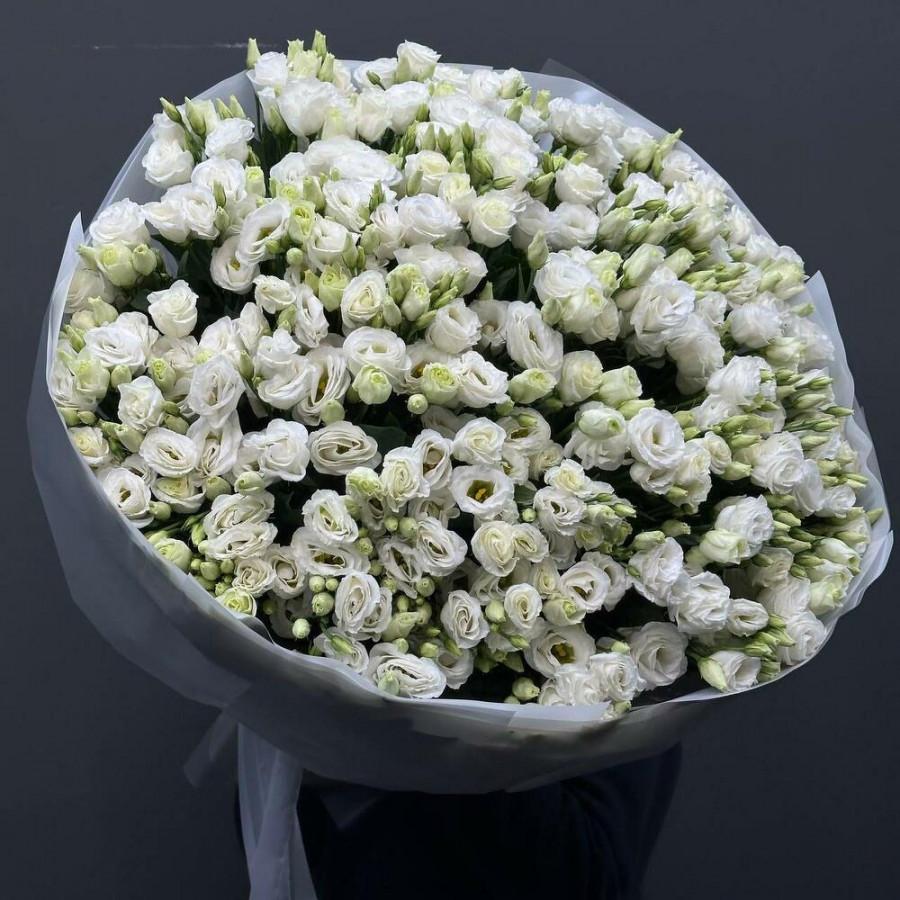 На фото букет из 101 белой эустомы. В составе: эустома (лизиантус) 101 шт, дизайнерская упаковка 4 шт, атласная лента 3 шт, . Все цветы свежие и ароматные, букет красиво оформлен и отлично подходит для подарка. Доступна доставка цветов или самовывоз.