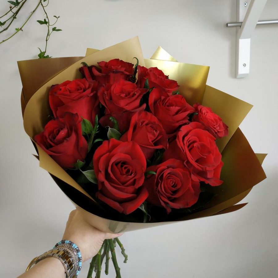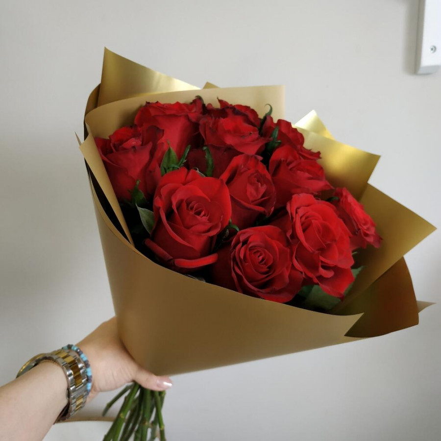 На фото букет из 11 бордовых роз. В составе: роза 11 шт, дизайнерская упаковка 1 шт, атласная лента 1 шт, . Все цветы свежие и ароматные, букет красиво оформлен и отлично подходит для подарка. Доступна доставка цветов или самовывоз.