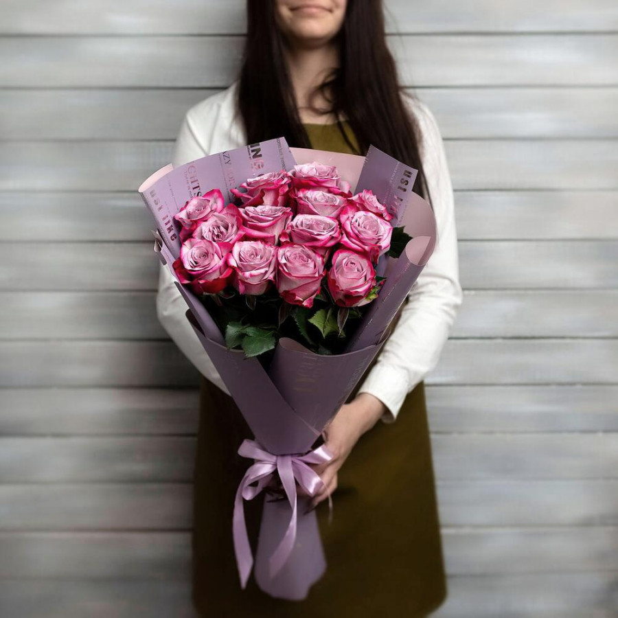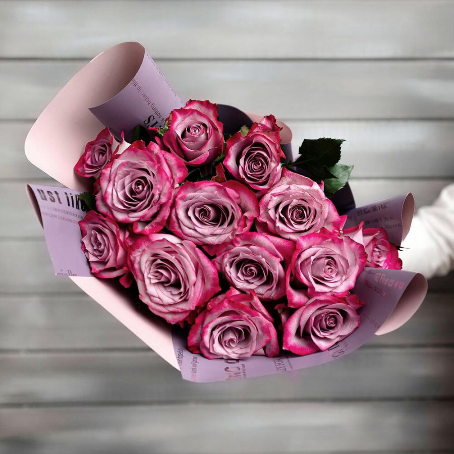 На фото букет из 13 фиолетовых роз. В составе: роза 13 шт, дизайнерская упаковка 1 шт, атласная лента 1 шт, . Все цветы свежие и ароматные, букет красиво оформлен и отлично подходит для подарка. Доступна доставка цветов или самовывоз.