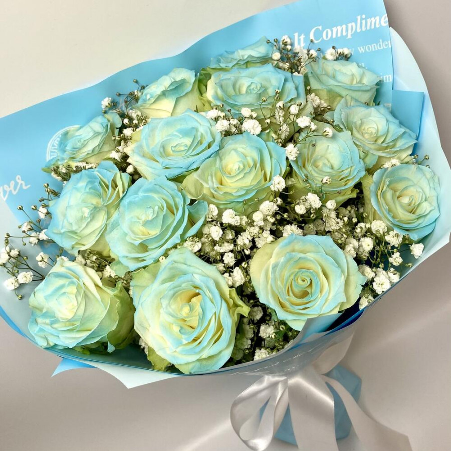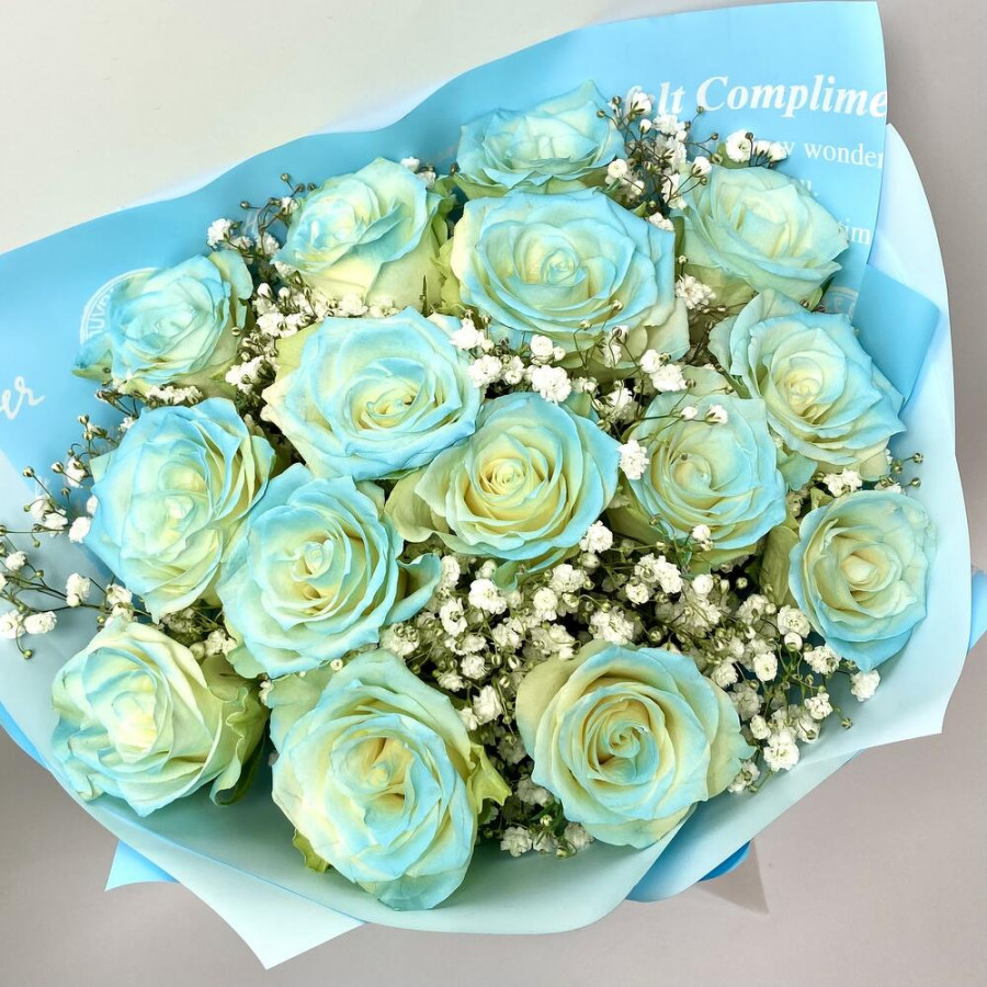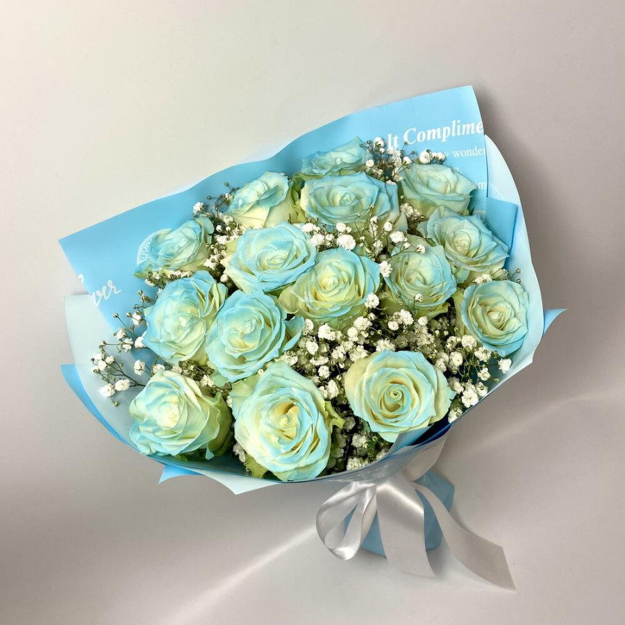 На фото букет из 15 голубых роз и гипсофилы. В составе: роза 15 шт, гипсофила 3 шт, дизайнерская упаковка 1 шт, атласная лента 1 шт, . Все цветы свежие и ароматные, букет красиво оформлен и отлично подходит для подарка. Доступна доставка цветов или самовывоз.
