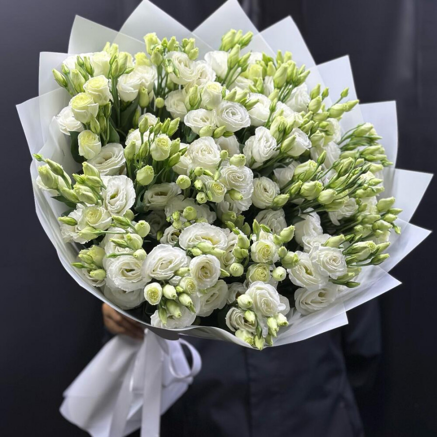 На фото букет 19 белых эустом. В составе: эустома (лизиантус) 19 шт, дизайнерская упаковка 3 шт, атласная лента 2 шт, . Все цветы свежие и ароматные, букет красиво оформлен и отлично подходит для подарка. Доступна доставка цветов или самовывоз.
