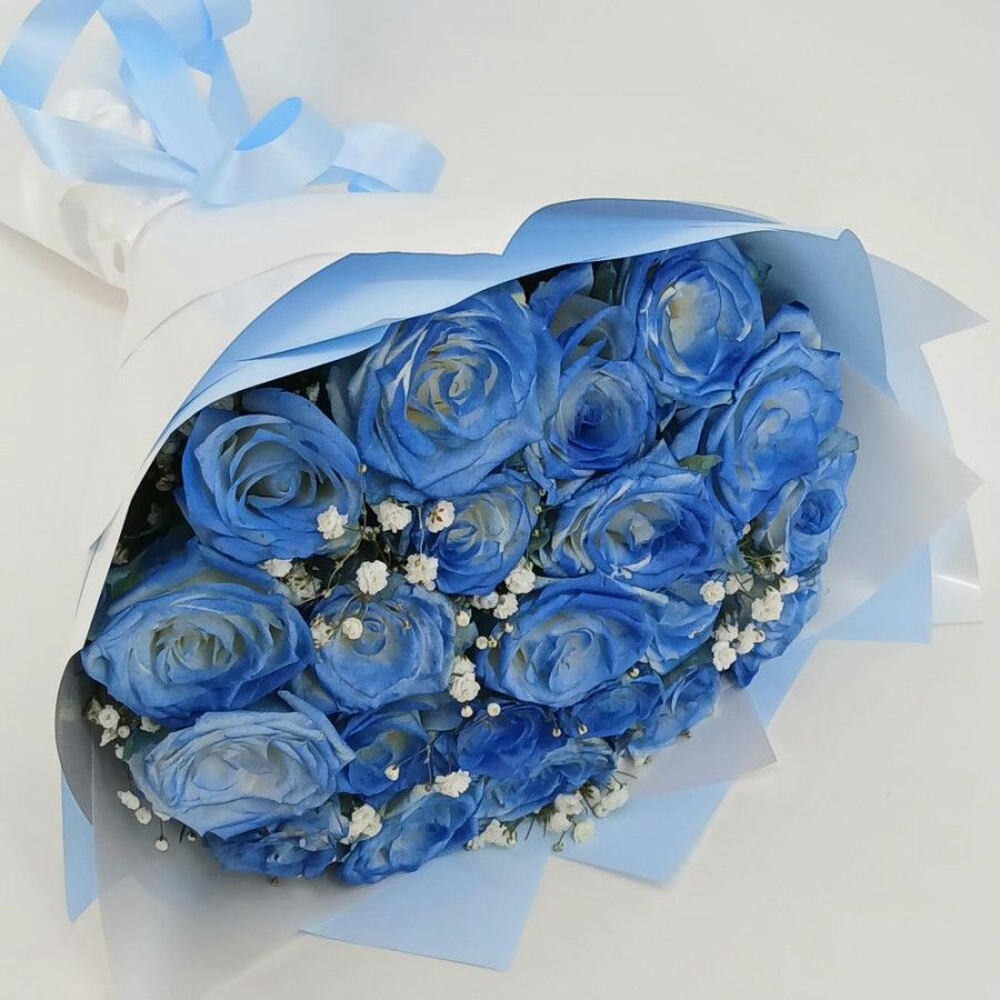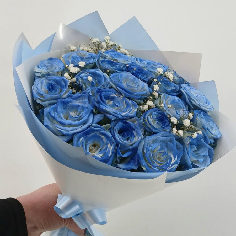 На фото букет из 21 голубой розы. В составе: роза 21 шт, дизайнерская упаковка 1 шт, атласная лента 1 шт, . Все цветы свежие и ароматные, букет красиво оформлен и отлично подходит для подарка. Доступна доставка цветов или самовывоз.