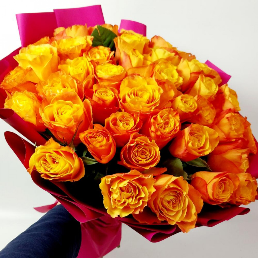 На фото букет из 35 оранжевых роз. В составе: роза 35 шт, дизайнерская упаковка 1 шт, атласная лента 1 шт, . Все цветы свежие и ароматные, букет красиво оформлен и отлично подходит для подарка. Доступна доставка цветов или самовывоз.
