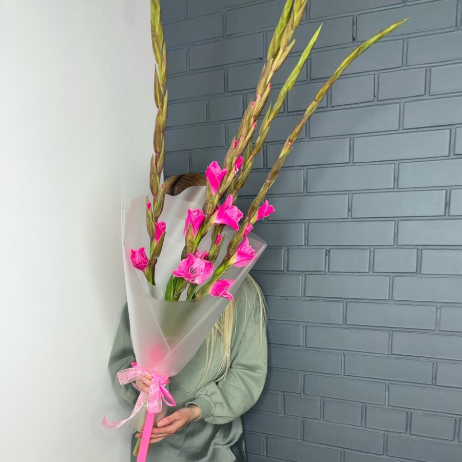 Атласная лента - 3 шт. Гладиолус - 5 шт. Дизайнерская упаковка - 1 шт.