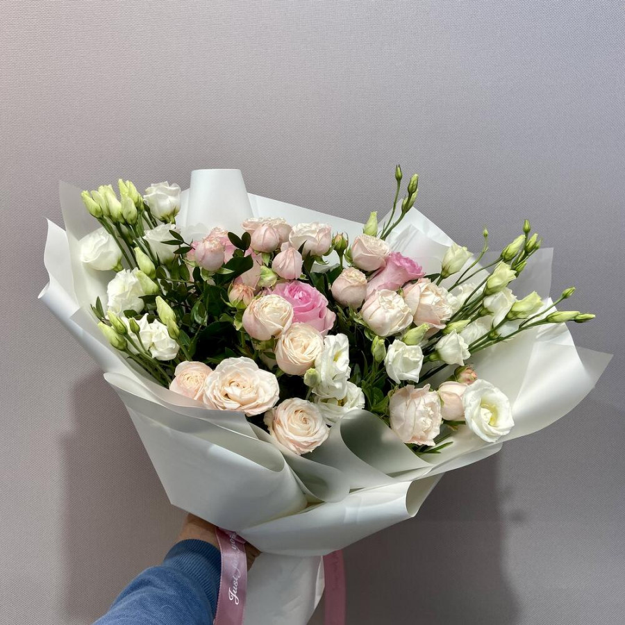 Букет из пионовидных роз и белых эустом в Берёзовском