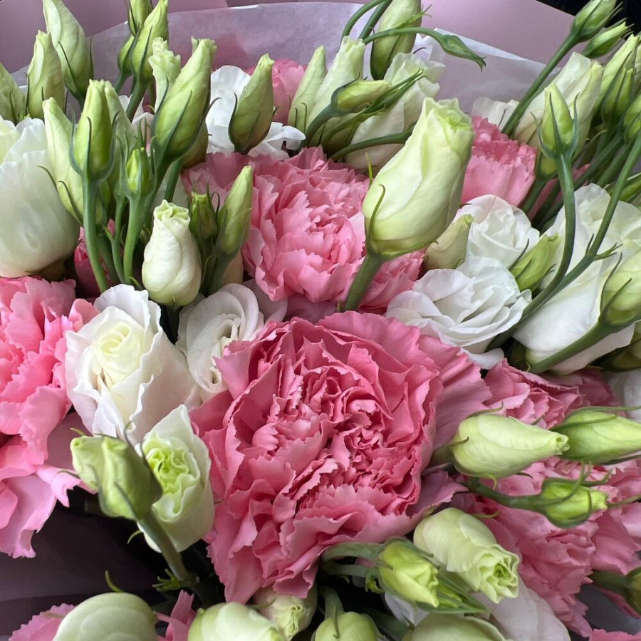 На фото букет «розовая нежность». В составе: гвоздика 10 шт, эустома (лизиантус) 3 шт, дизайнерская упаковка 2 шт, атласная лента 1 шт, . Все цветы свежие и ароматные, букет красиво оформлен и отлично подходит для подарка. Доступна доставка цветов или самовывоз.