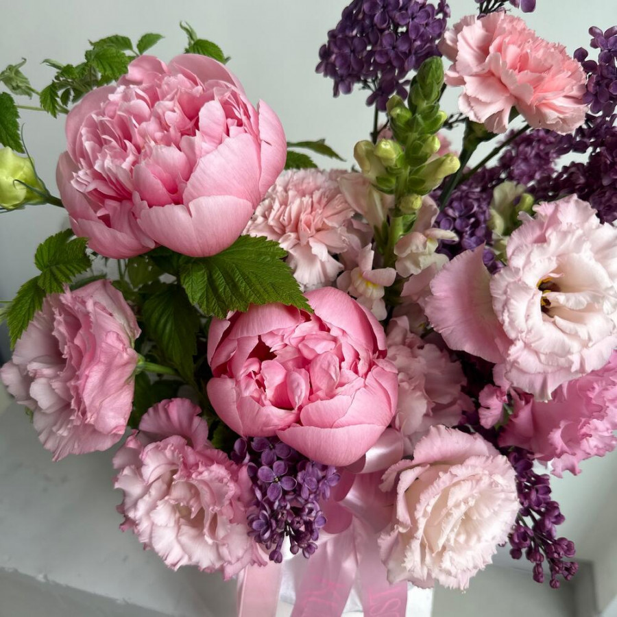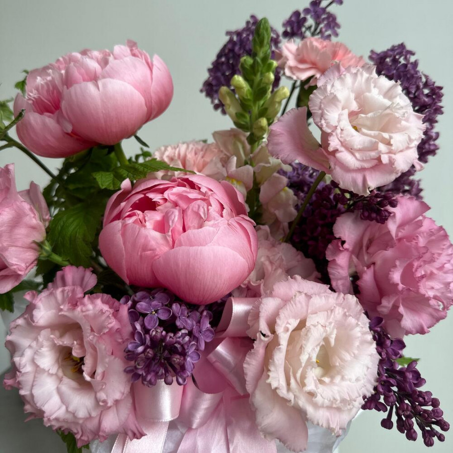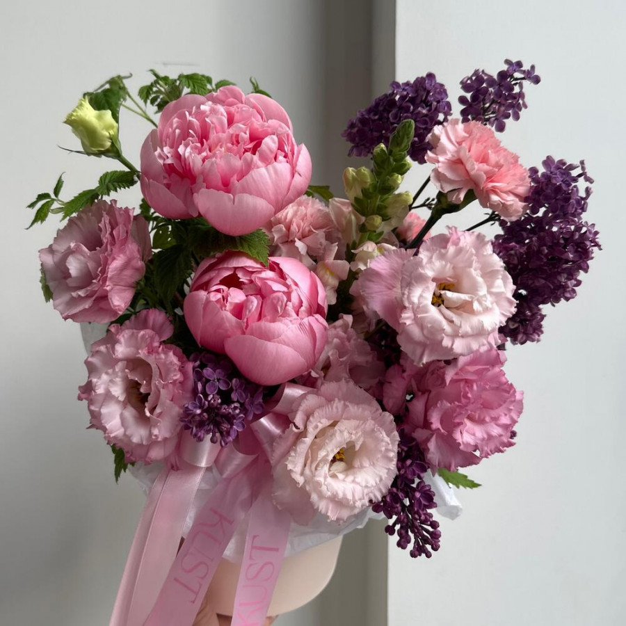 На фото цветочная композиция с сиренью и пионами. В составе: сирень 2 шт, эустома (лизиантус) 3 шт, диантус 5 шт, антирринум 3 шт, оазис флористический 2 шт, шляпная коробка (m) 1 шт, атласная лента 1 шт, . Все цветы свежие и ароматные, букет красиво оформлен и отлично подходит для подарка. Доступна доставка цветов или самовывоз.